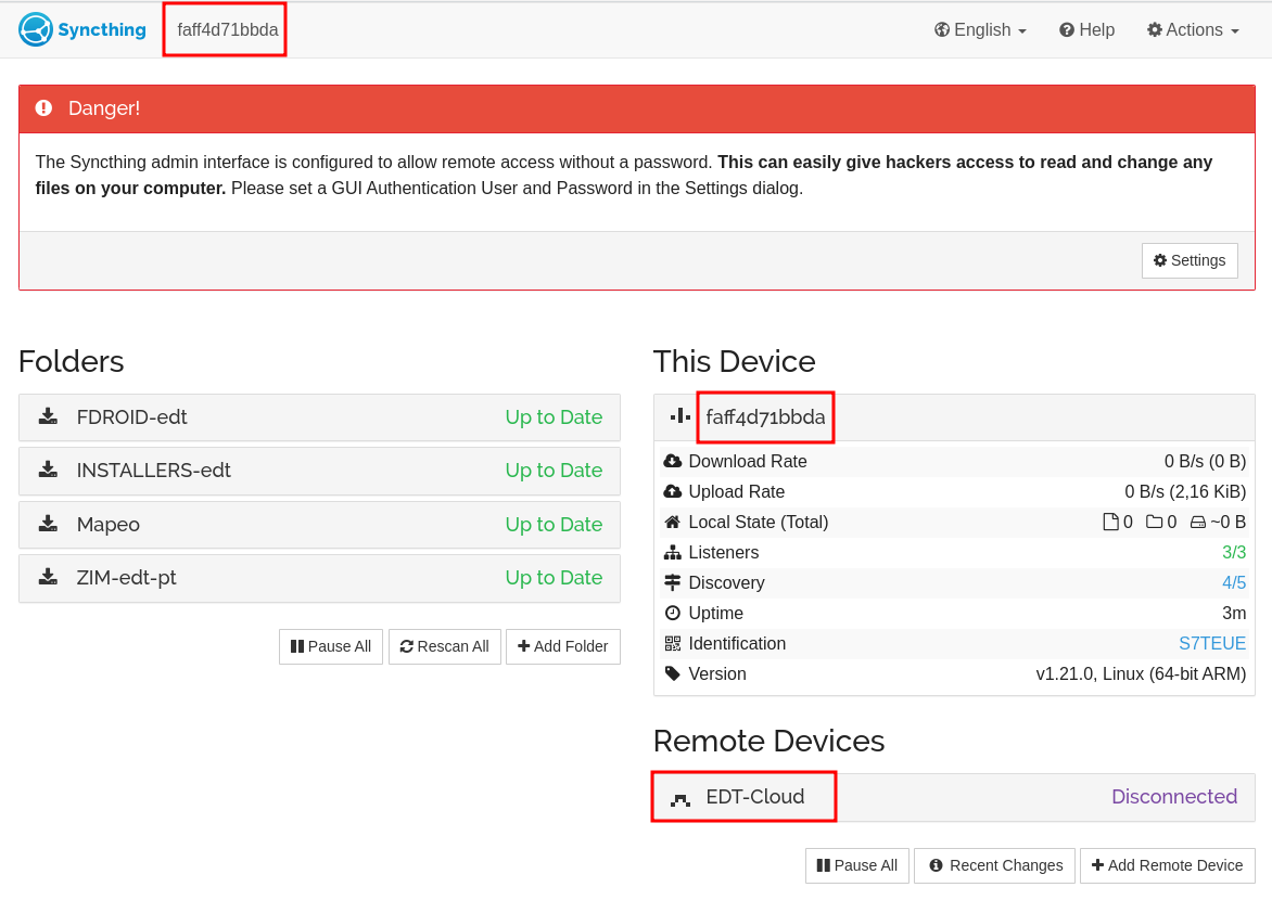 The first time a device is connected it’ll send a request to Earth Defenders Toolkit Cloud to start syncing content. Get the ID from the the local Offline Toolkit Syncthing instance: