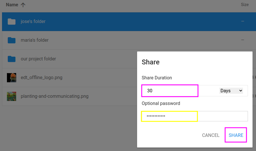Seleccione la duración de la acción de compartir y si se necesita una contraseña, y finalmente haga clic en Compartir: