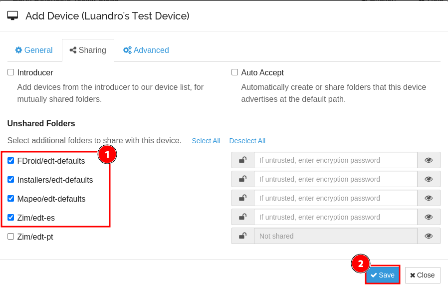 Na página **Compartilhamento** selecione todas as pastas relevantes para o novo dispositivo, geralmente as defautls: