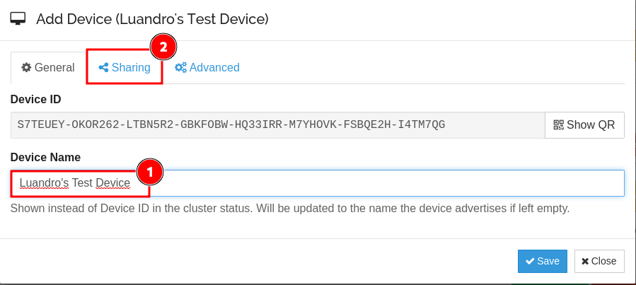 Dê um nome descritivo ao novo dispositivo e vá para a página de **Compartilhamento**.